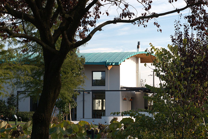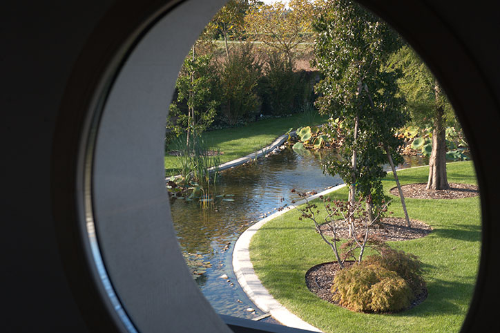 La forma tonda delle finestre e la circolarità del parapetto richiamano, a livello formale, il laghetto esterno, che è stato sistemato, come il resto del giardino e la terrazza, conducendo uno specifico studio ambientale.